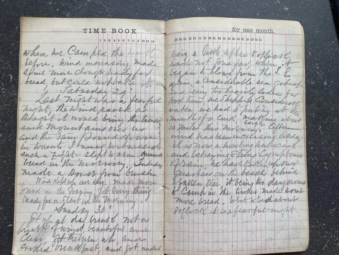 Volume 1 to 3 of the diary are of identical type, notebooks with dark maroon soft covers. The text inside is written in ink and chronicles Thomas’ journey up to the Queen Charlotte Islands from Victoria aboard the sloop ‘Thornton’ and the bulk of his stay in Skidegate Inlet.