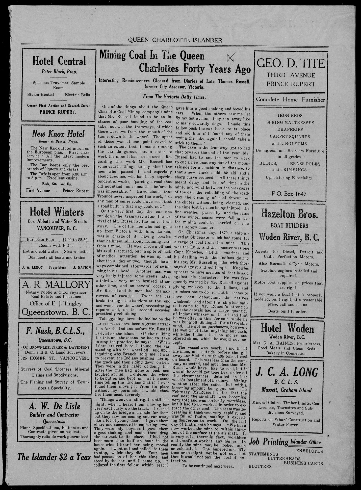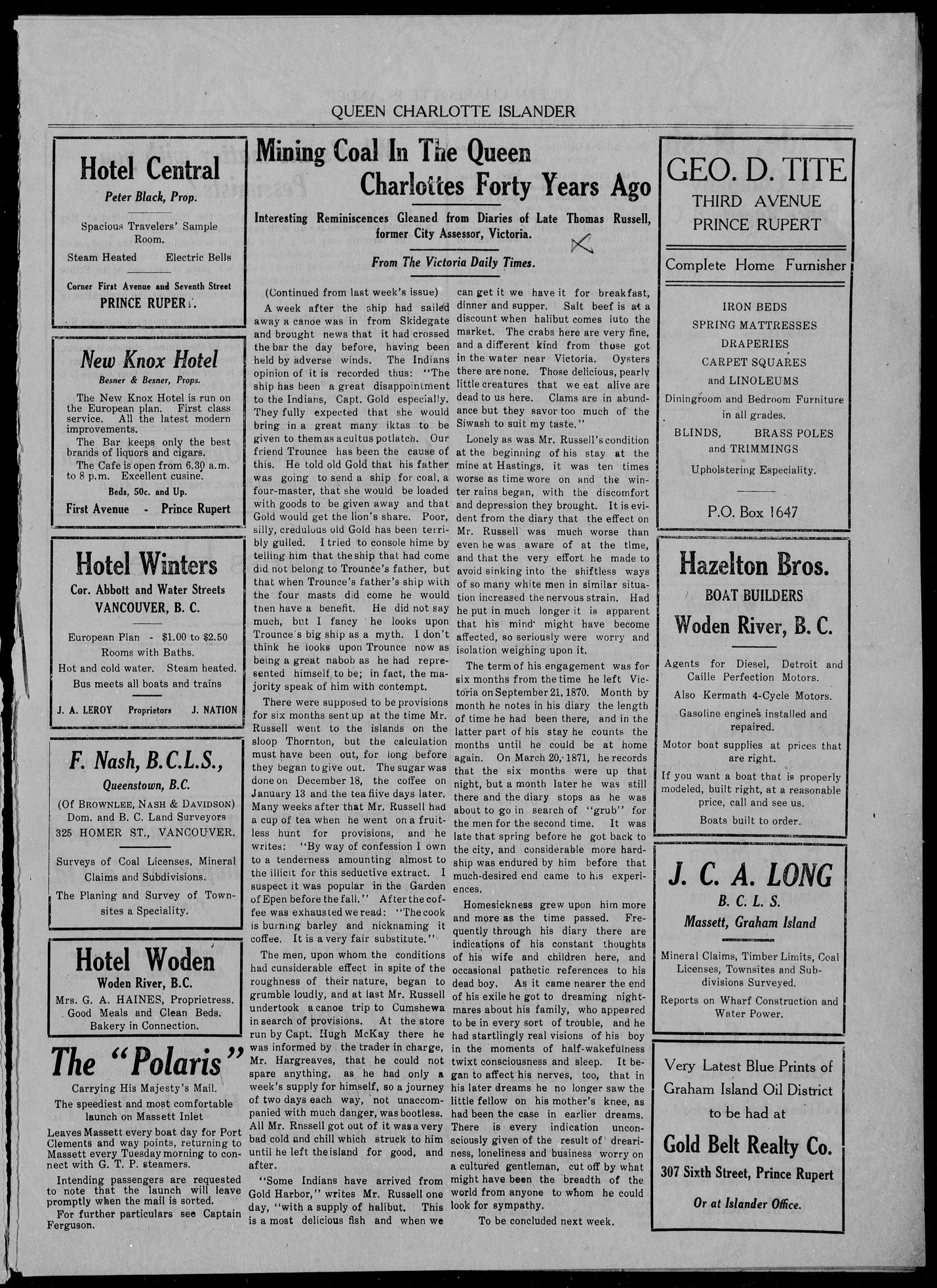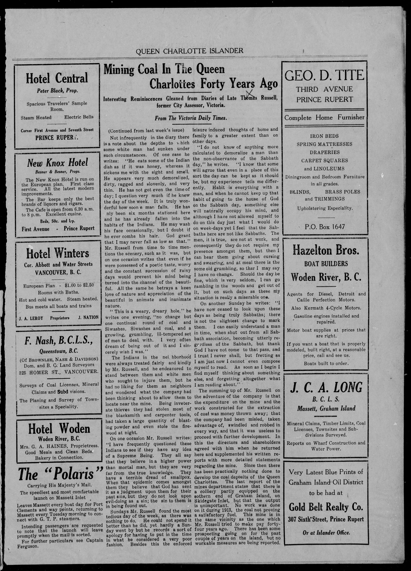 The Michael family, to which the diary had been passed, must have loaned them to a reporter in early 1914 as a précis of the diary was published as a substantial article in the Victoria Daily Times Saturday July 25th 1914 page 11 under the heading ‘Mining Coal in the Queen Charlottes Forty Years Ago; An unusual Record: Interesting Reminiscences Gleaned from Diaries of late Thos. Russell, former City Assessor, Victoria.’