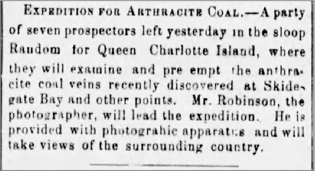 Faced with this “imperfect,” but encouraging information, the Queen Charlotte Coal Mining Company “Limited” (QCCCo) was registered on June 5th, 1865. On July 6th, a call to shareholders was made for funds to underwrite a second expedition to Skidegate, which George Robinson—formerly superintendent of coal mines at Nanaimo, and subsequently a well-known photographer—was hired to lead. Robinson was also a “significant” shareholder in the company.