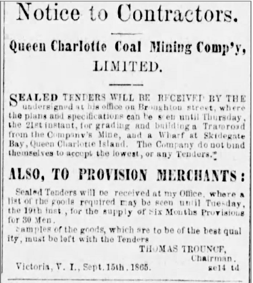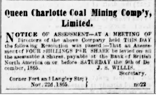 As reported in the 1865 Prospectus and Report with Articles of Association of the Queen Charlotte Coal Mining Company “Limited”: