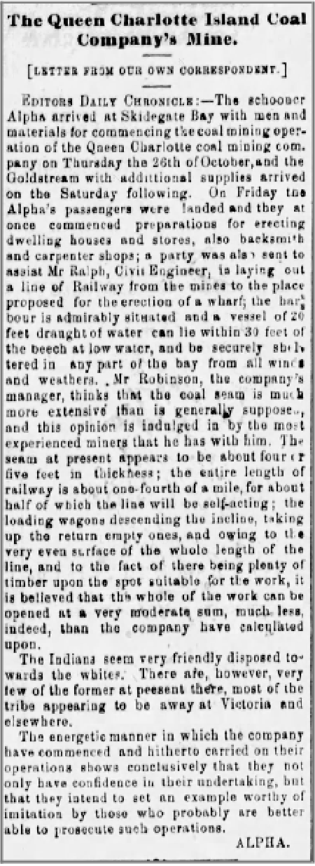 An article in the Victoria Daily Chronicle, shown below, comprehensively describes the work commenced upon arrival of the schooners at Skidegate on October 26th, 1865.