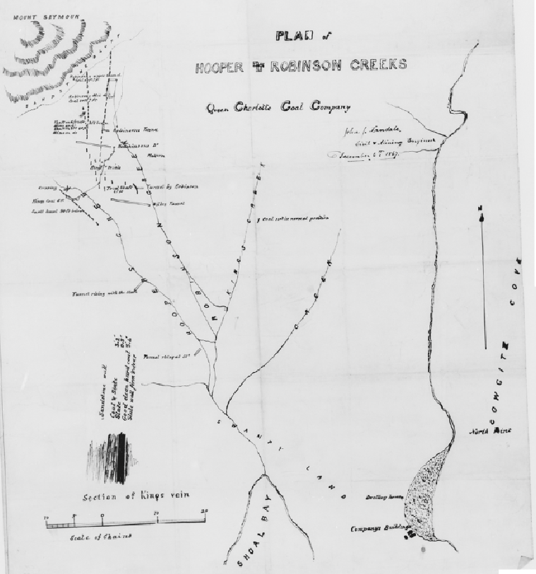 Landale, J.J. 1867. Plan of Hooper and Robinson Creeks Queen Charlotte Coal Company. B.C. Archives File CM/A218. William Henry Langley Fonds PR-0625.
