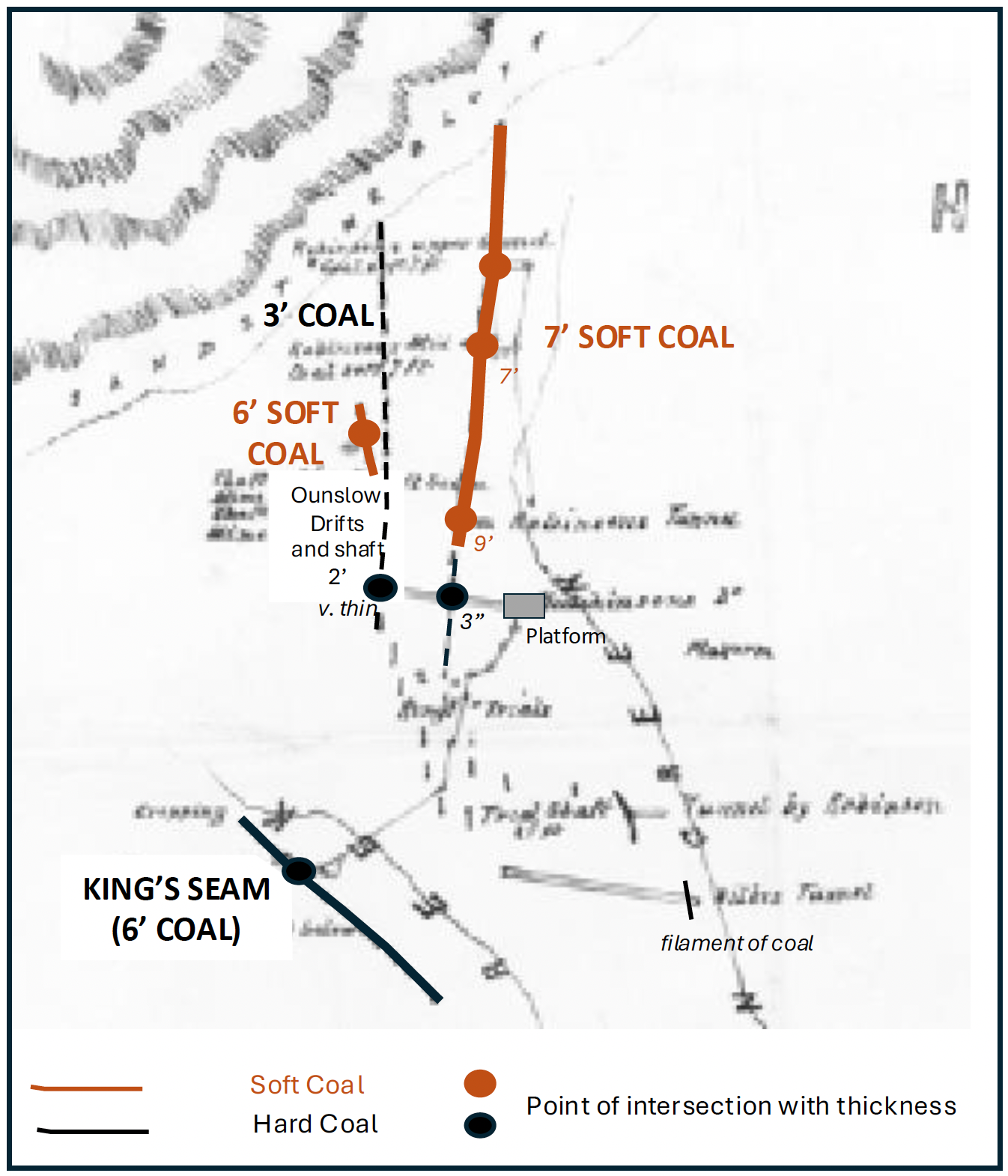 The principal deposit appears to have been an outcropping of good hard anthracite west of Hoopers Creek (NEED LINK), variably referred to as the “6 foot seam” or King’s coal or vein.