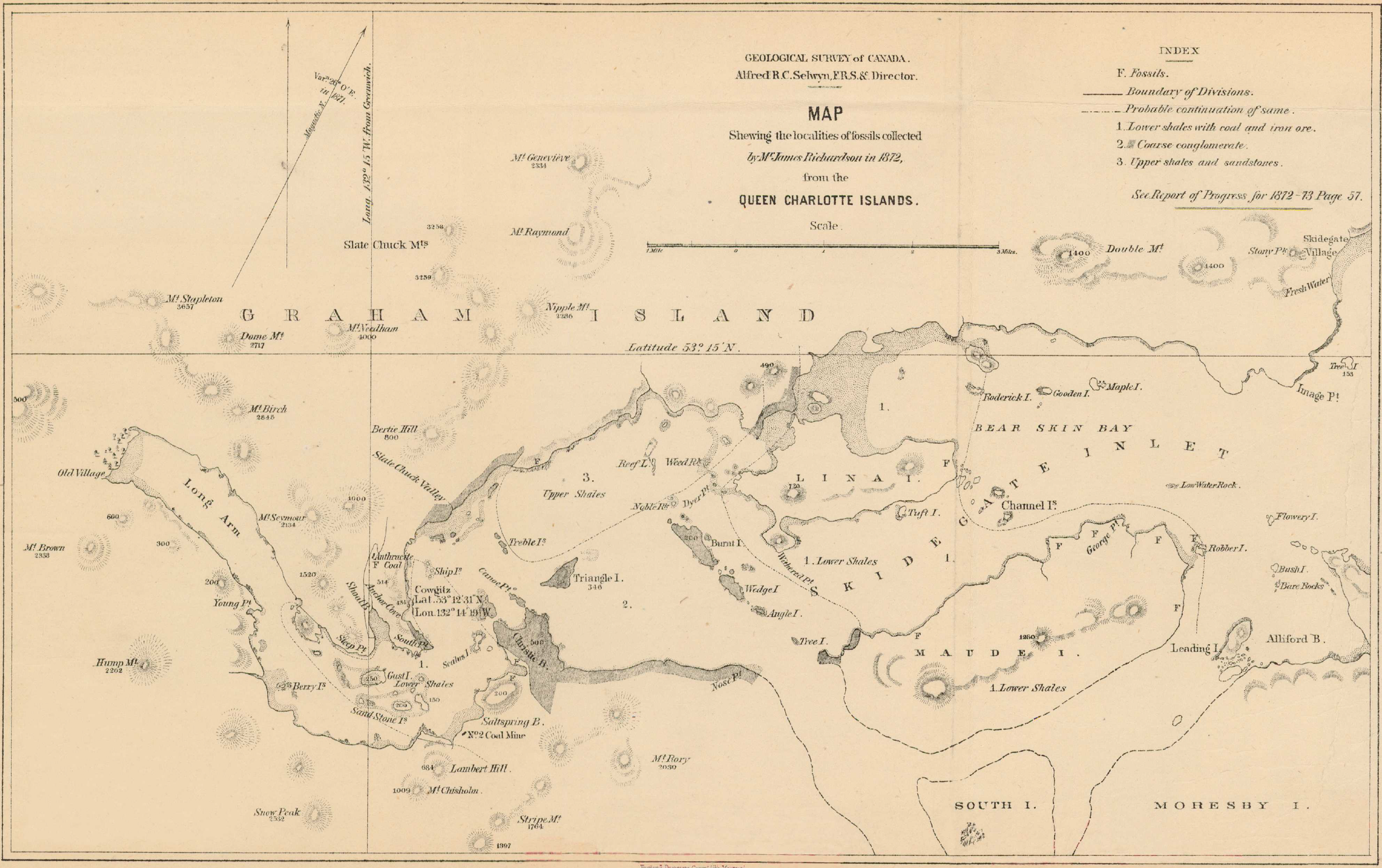 Geological Survey of Canada & Commission géologique du Canada (1876). Map showing the localities of fossils collected by James Richardson in 1872, from the Queen Charlotte Islands. Geological Survey of Canada, Multicoloured Geological Map, 435. https://doi.org/10.4095/214731