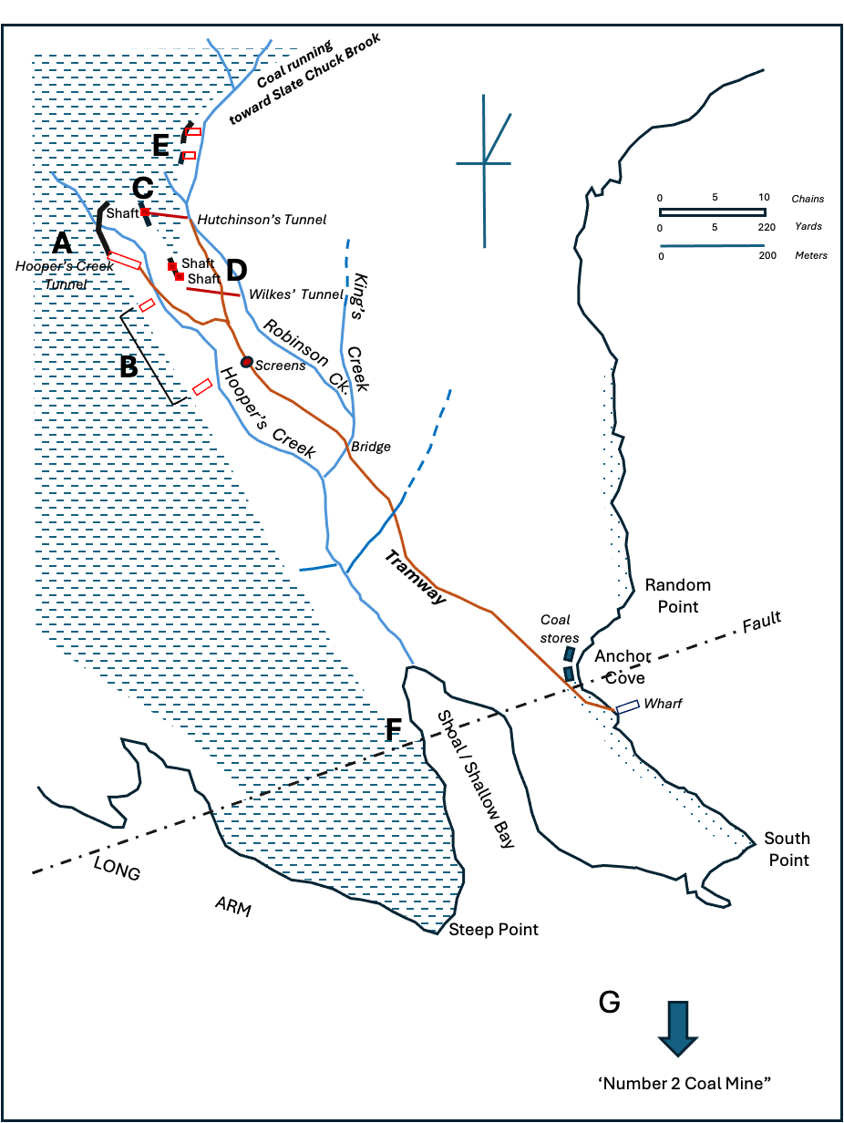 Based on Figure 4 of Dawson, G.M. 1880 Report on the Queen Charlotte Islands in Geological Survey of Canada 1878-79 Report of Progress p. 72, identifying by letters A-G the works described in Richardson J. 1873 Report on the Coal Fields of Vancouver and Queen Charlotte Islands with a map of the distribution of the ormer addressed to Alfred R.C. Selwyn, Esq., F.G.S. Director of the Geological Survey of Canada pages 57-61.